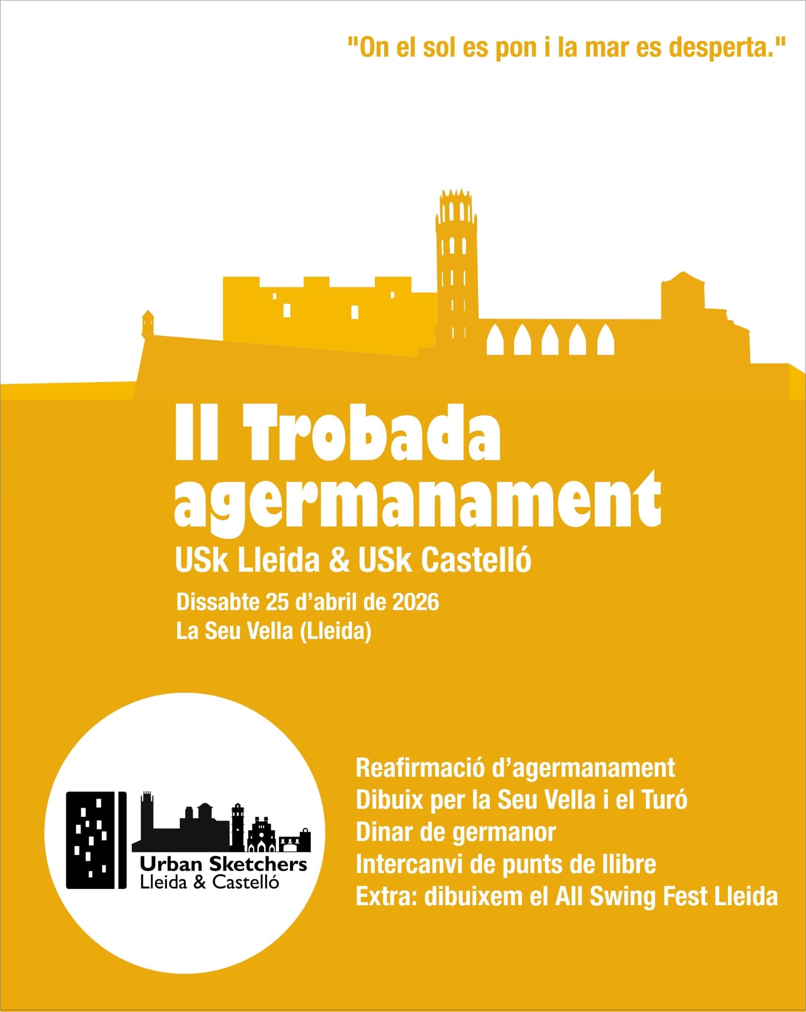 - Amb motiu de la reafirmació a Lleida de l’agermanament de les dues agrupacions, el proper dia 25 d’abril tindrà lloc la “2a Trobada. Agermanament d’Urban&Sketcher Lleida i d’Urban Sketchers Castelló”.