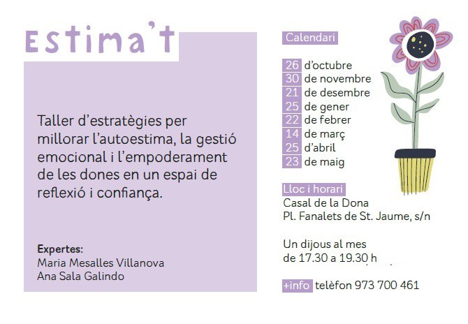 - Taller d’estratègies per millorar l’autoestima, la gestió emocional i l’empoderament de les dones en un espai de reflexió i confiança. Expertes: Maria Mesalles Villanova Ana Sala Galindo