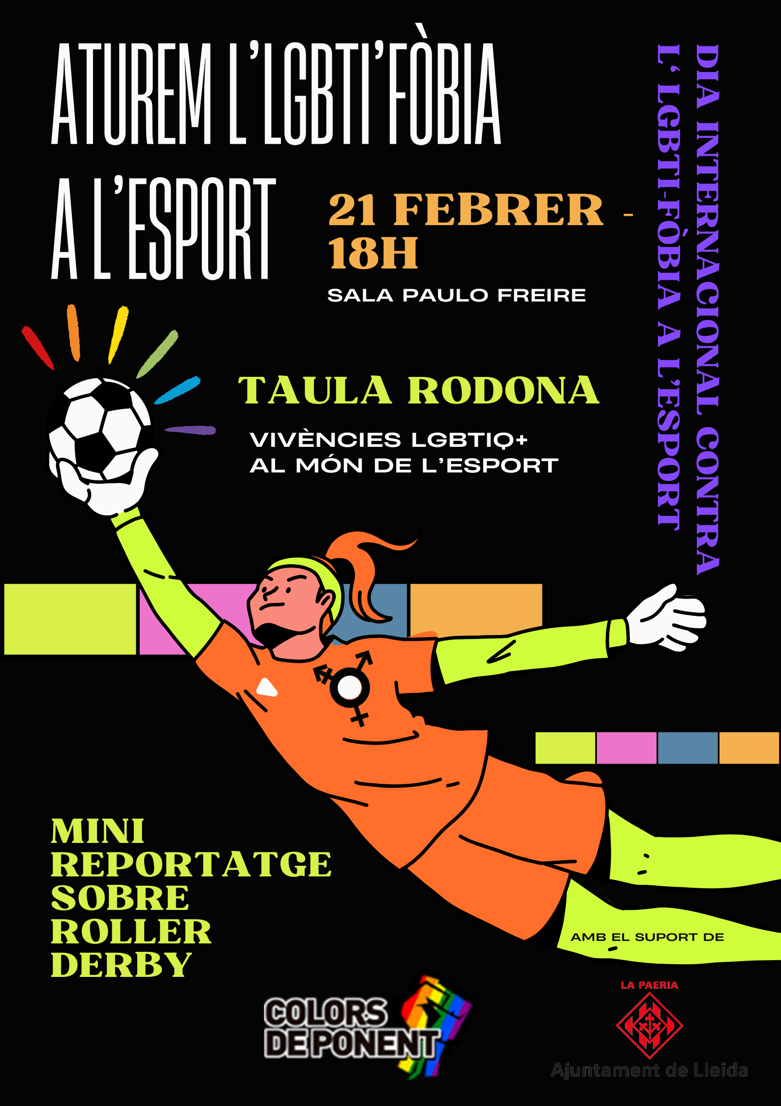 Amb motiu del Dia Internacional contra la LGBTI-fòbia a l'esport, l'associació Colors de Ponent, amb el suport de l'Ajuntament de Lleida, organitza una jornada de conscienciació i debat.