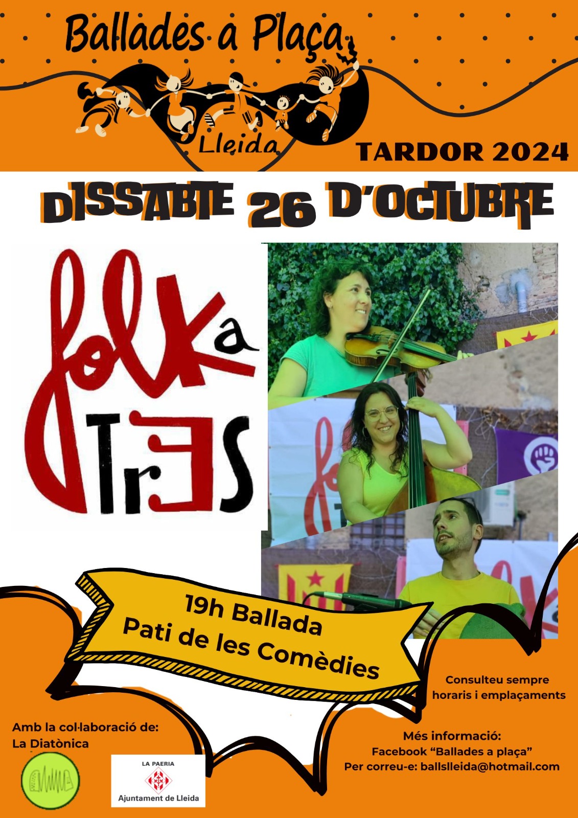 Primera ballada de la temporada, dissabte 26 d'octubre a les 19 h al Pati de les Comèdies amb la formació Folkatr3s.