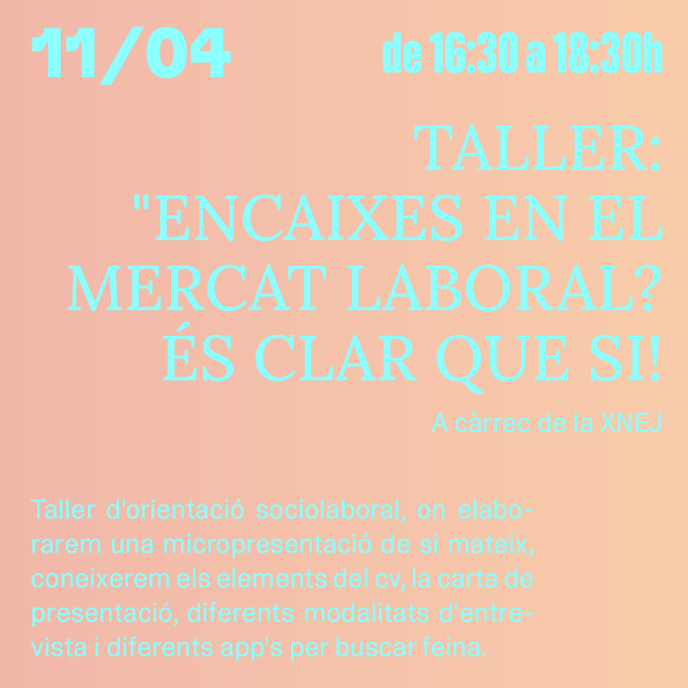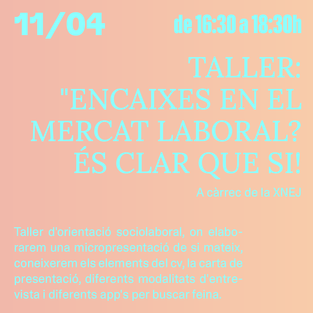 - 11/04 de 16.30 a 18.30h: TALLER: ENCAIXES EN EL MERCAT LABORAL? ÉS CLAR QUE SI! A càrrec de la XNEJ