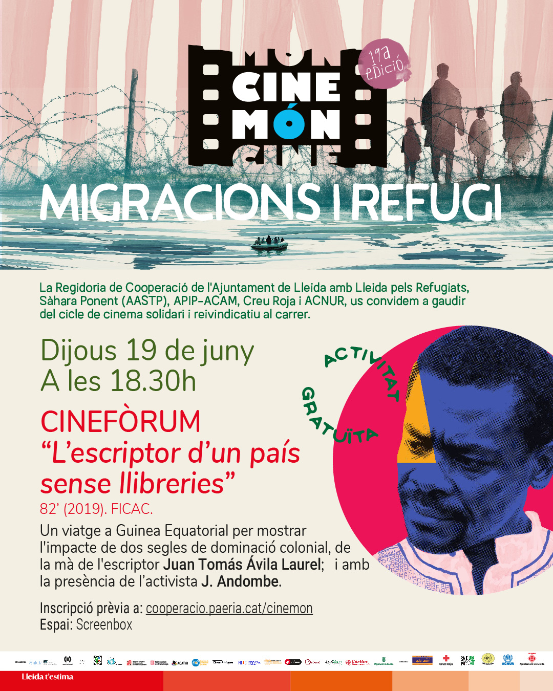- Projecció del film L’escriptor d’un país sense llibreries (82’, 2019), dins el Festival Itinerant de Cinemes Africans de Catalunya (FICAC). Un viatge a Guinea Equatorial de la mà de l’escriptor Juan Tomás Ávila Laurel, refugiat a Espanya per la seva lluita contra la dictadura d’Obiang. En versió original en castellà i crioll annobonès, subtitulada en català. Amb la presència de Juan Tomás Ávila Laurel, l’activista José Andombe i moderació del Departament de Drets Civils de l’Ajuntament de Lleida. Cal inscripció prèvia!!