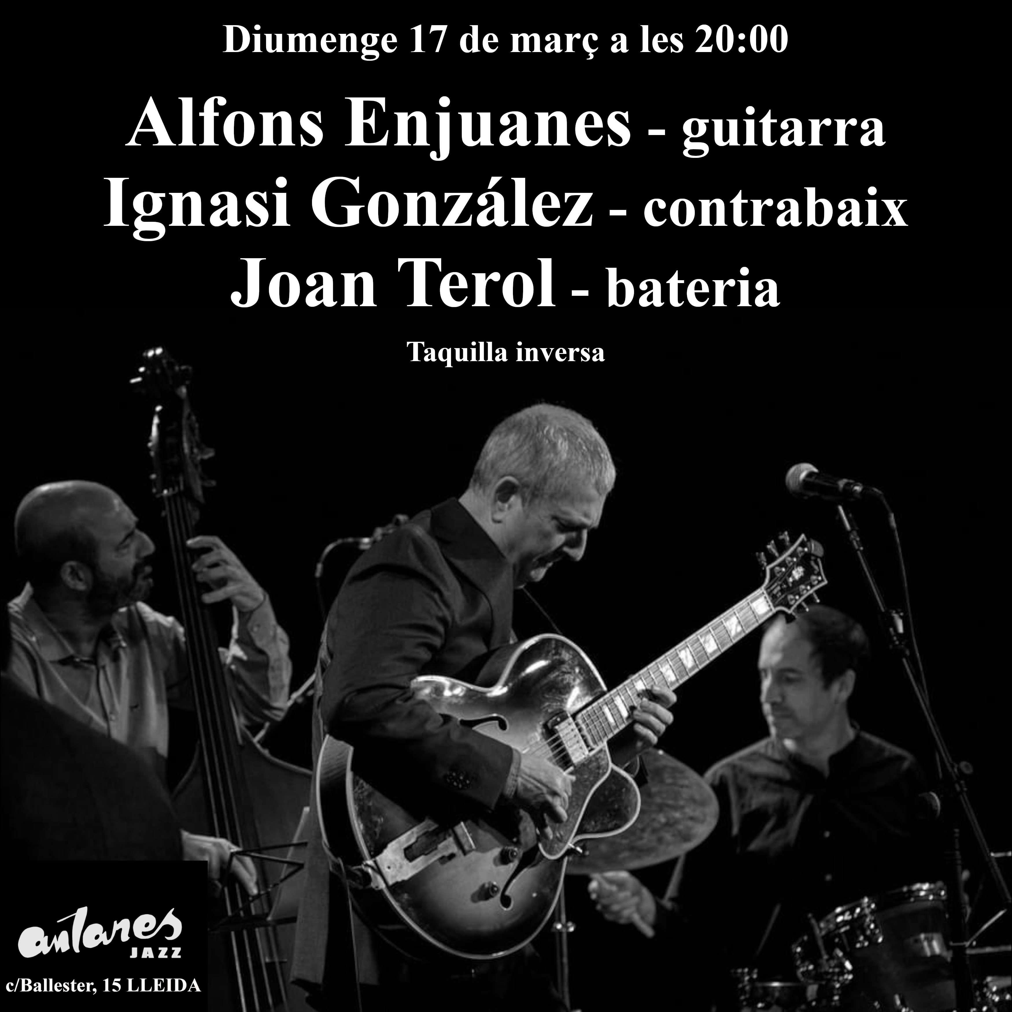 Segona sessió del cicle de guitarristes de jazz. Aquest cop tindrem el trio format per el gran guitarrista lleidatà Alfons Enjuanes, Ignasi González al contrabaix i Joan Terol a la bateria.