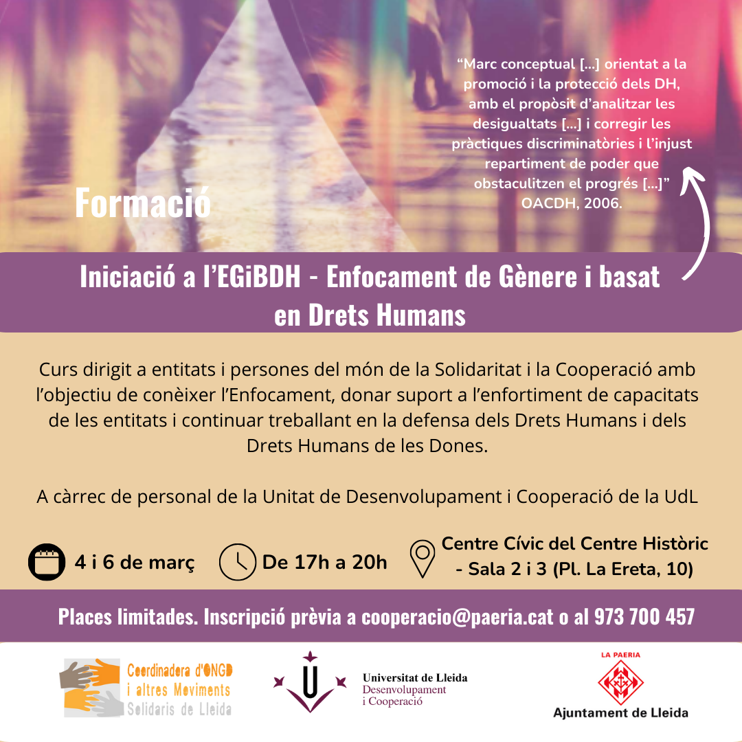 - Des de la Coordinadora d'ONGD i aMS de Lleida, la Unitat de Desenvolupament i Cooperació de la UdL i la Regidoria de Cooperació de l'Ajuntament de Lleida s'organitza i s'oferta el curs "Iniciació a l'Enfocament de Gènere i basat en Drets Humans", una formació dirigida a entitats per iniciar-se en el coneixement de l'EGiBDH i poder aplicar-lo en els projectes en defensa dels DH i dels DHD. Curs en format presencial amb confirmació d'assistència a cooperacio@paeria.cat o trucant al telèfon 973 700 457 Data i hora: 4 i 6 de març de 2024, de 17h a 20h. Lloc: Centre Cívic del Centre Històric. Sala 2 i 3 (Pl. La Ereta, 10)