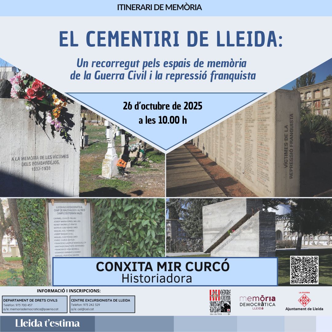 En aquesta ocasió, el recorregut se centrarà en els Espais de Memòria del Cementiri Municipal de Lleida, un indret de gran valor simbòlic i històric que conserva les empremtes de la Guerra Civil, la repressió franquista i la deportació als camps de concentració nazis.