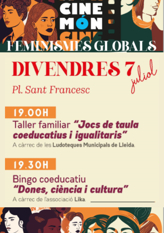 • Espai de joc per a tota la familia. A partir de les 19.00h - Taller familiar “Jocs de taula coeducatius i igualitaris”, a càrrec de les Ludoteques Municipals de Lleida; i a partir de les 19.30h - Bingo coeducatiu “Dones, ciència i cultura”, a càrrec de l’associació Lika. Lloc, data i hora: Plaça Sant Francesc. Divendres 7 de juliol, a partir de les 19h Més informació a cooperacio.paeria.cat/cinemon