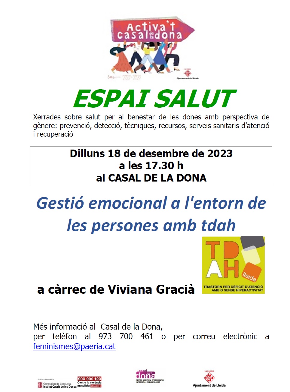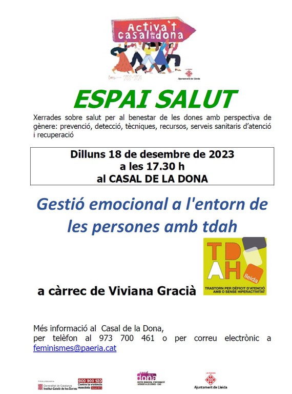 - Xerrades sobre salut per al benestar de les dones amb perspectiva de gènere: prevenció, detecció, tècniques, recursos, serveis sanitaris d’atenció i recuperació. Amb la col·laboració de les entitats de salut del municipi de Lleida.