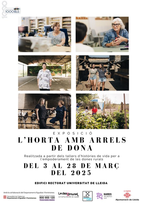 L'exposició "L'Horta amb arrels de dona" es va presentar en commemoració del Dia Internacional de la Dona Pagesa del 2024 com a homenatge a les dones de l'Horta de Lleida. A través dels retrats i els relats de vida de set dones, representants de diverses generacions, es posa en valor la seva experiència vital i la seva contribució a la història d’aquest espai. Els seus rostres i les seves veus reivindiquen la importància de mantenir una relació de respecte, connexió i cura amb la terra com la principal font de vida i sustent de tots els éssers. A través d’aquestes trobades, les dones ens fan reflexionar sobre el futur de l'Horta, una part essencial del nostre patrimoni col·lectiu.