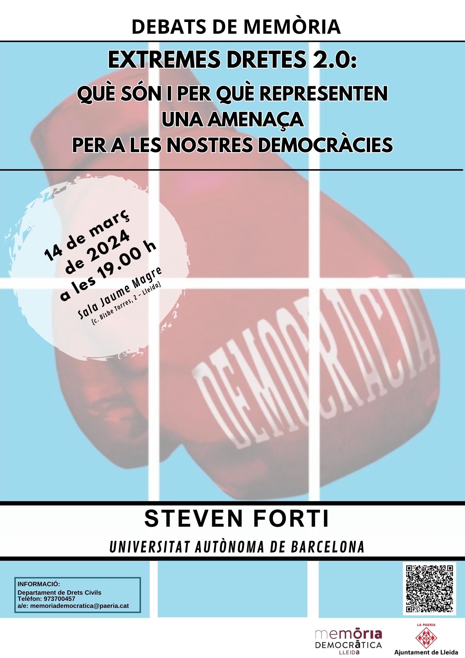 La conferència serà a càrrec de Steven Forti (Trento, Italia, 1981). Doctor en Història per la Universitat Autònoma de Barcelona (UAB) i la Università di Bologna. Professor agregat d'Història Contemporània a la UAB. És autor d'Extrema derecha 2.0. Qué es y cómo combatirla (Siglo XXI de España, 2021), coautor de Patriotas indignados. Sobre la nueva ultraderecha en la Posguerra Fría. Neofascismo, posfascismo y nazbols (Alianza, 2019) i editor de Mitos y cuentos de la extrema derecha (Libros de la Catarata, 2023). És membre del Centre d’Estudis sobre Dictadures i Democràcies (CEDID-UAB) i del consell de redacció de les revistes CTXT, Política & Prosa i Spagna Contemporanea. Actualment és el coordinador local del projecte de recerca europeu “Analysis of and Response to Extremist Narratives” (ARENAS).