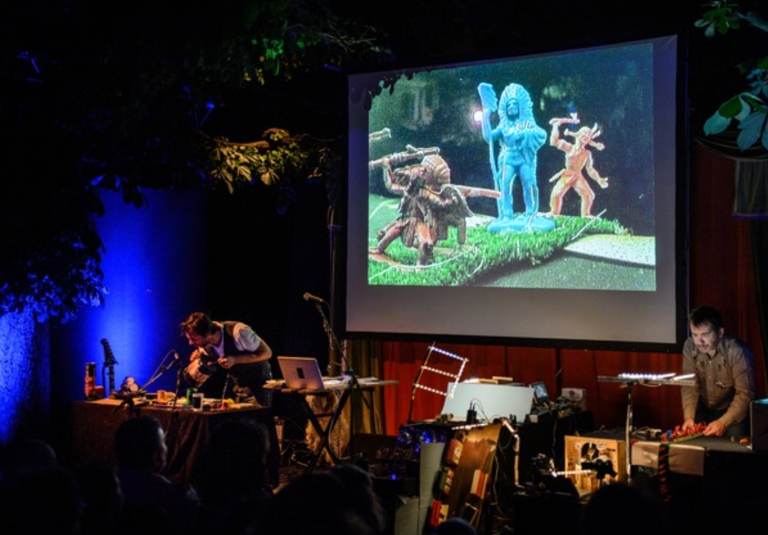 En base a la instal·lació de les càmeres, de les taules de mescla, de mini estudis de rodatge, d'efectes especials i altres tècniques cinematogràfiques, els dos companys fabriquen sota els ulls del públic una pel·lícula que es projecta en directe.