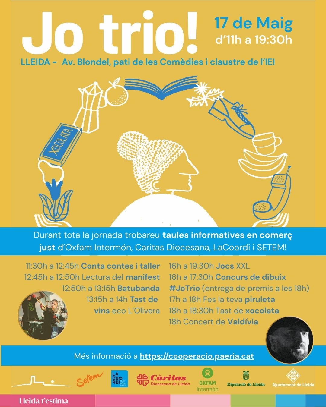 El pròxim 17 de maig, de 11:00h a 19:30h, Lleida acollirà una nova jornada dedicada al Comerç Just sota el lema “Jo trio!”, als espais de l’Av. Blondel, el Pati de les Comèdies i el Claustre de l’IEI. Durant tot el dia hi haurà taules informatives de Comerç Just a càrrec d’Oxfam Intermón, Càritas Diocesana, LaCoordi i SETEM. La programació començarà a les 11:30h amb una sessió de conta contes i taller, seguida a les 12:45h de la lectura del manifest. Just després, a les 12:50h, la Batubanda posarà el ritme a la jornada, i cap a les 13:15h començarà un tast de vins ecològics amb el celler La Olivera.