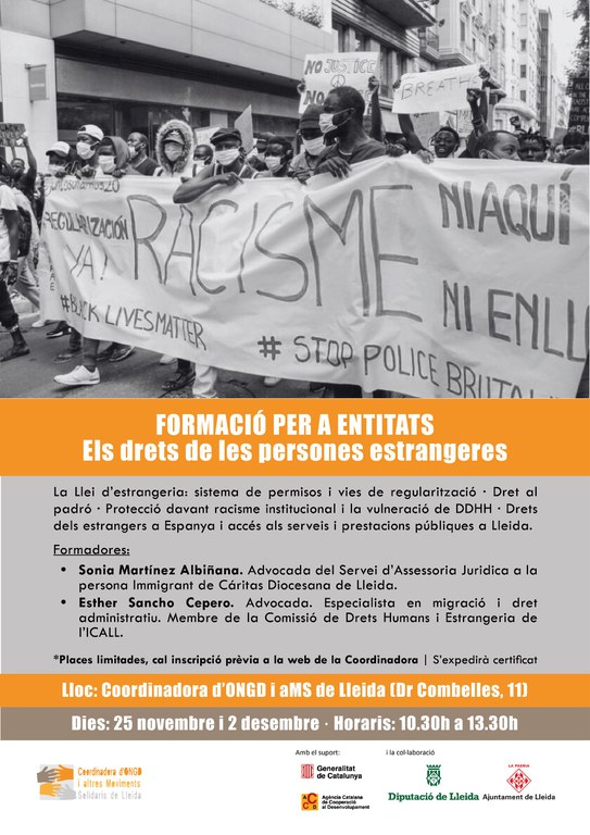 • Un recorregut per la Llei d'Estrangeria, el padró, la defensa dels DH i la protecció enfront el racisme, els drets de les persones estrangeres i les prestacions públiques. Cobnduit per la Sònia Martínez Albiñano i l'Esther Sancho Cepero, advocades. Inscripció prèvia, gratuïta i amb certificat d'assistència. Lloc: Coordinadora d'ONGD i aMS de Lleida (C/ Dr Combelles, 11), els dies 25 de novembre i 2 de desembre, de 10:30h a 13:30h. Organitzat per la Coordinadora d'ONGD i aMS de Lleida Inscripcions a https://forms.gle/9ac76x54vpVgtueA7
