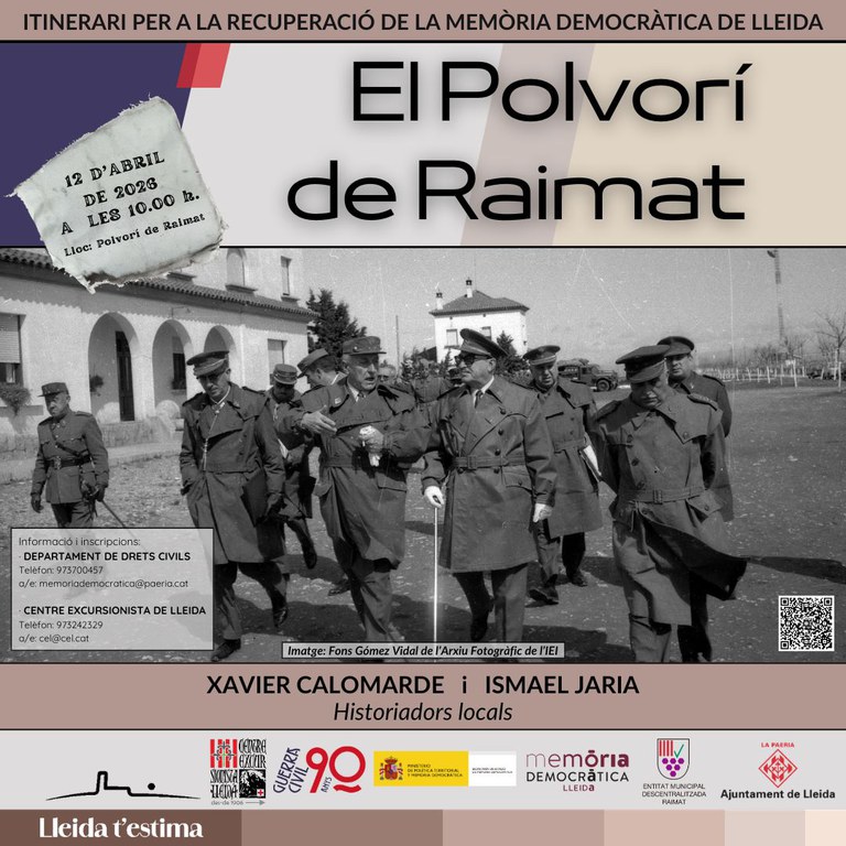 - El Polvorí de Raimat, espai clau en l’estratègia militar republicana durant la Guerra Civil i, alhora, un element patrimonial de primer ordre. L’itinerari serà conduït per Xavier Calomarde i Ismael Jaria, dos veïns de Raimat que han estudiat profundament el passat agrícola, social i bèl·lic del poble, i que han contribuït decisivament a documentar i difondre la seva memòria. Gràcies a la seva recerca i divulgació, el Polvorí de Raimat s’ha consolidat com un element clau per interpretar el passat bèl·lic del municipi i per preservar la memòria local.
