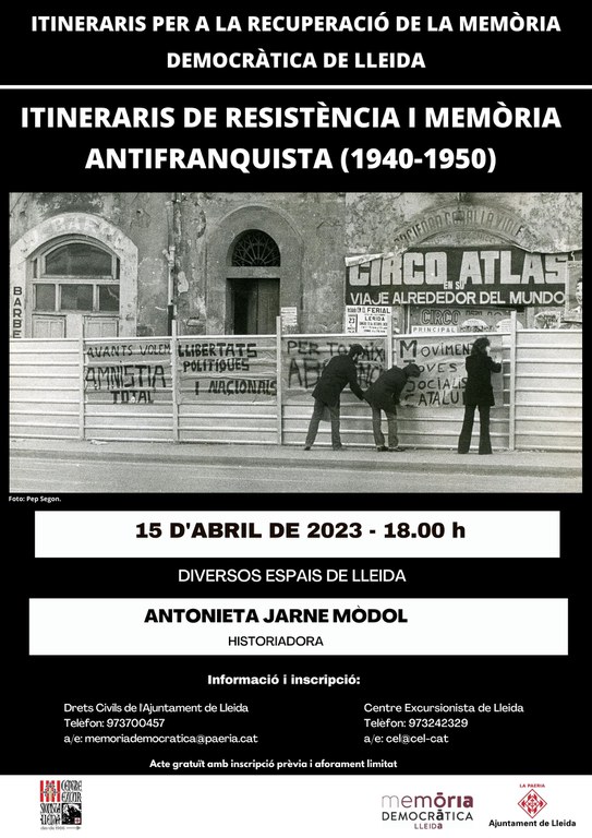 Els itineraris de resistència i memòria antifranquista formen part de la Lleida invisibilitzada, conseqüentment força oblidada, que convé recuperar per a l’imaginari col·lectiu de la ciutat. Aquesta circumstància és encara més accentuada pel que fa als anys del primer franquisme quan la repressió i les estratègies de control de la dictadura eren més contundents i violentes. En l’itinerari del 15 d’abril (que començarem davant l'actual Caixa Forum, antic cinema Viñes) recorrerem aquells paisatges que durant els anys quaranta i cinquanta significaren espurnes de resistència política i cívico-social.