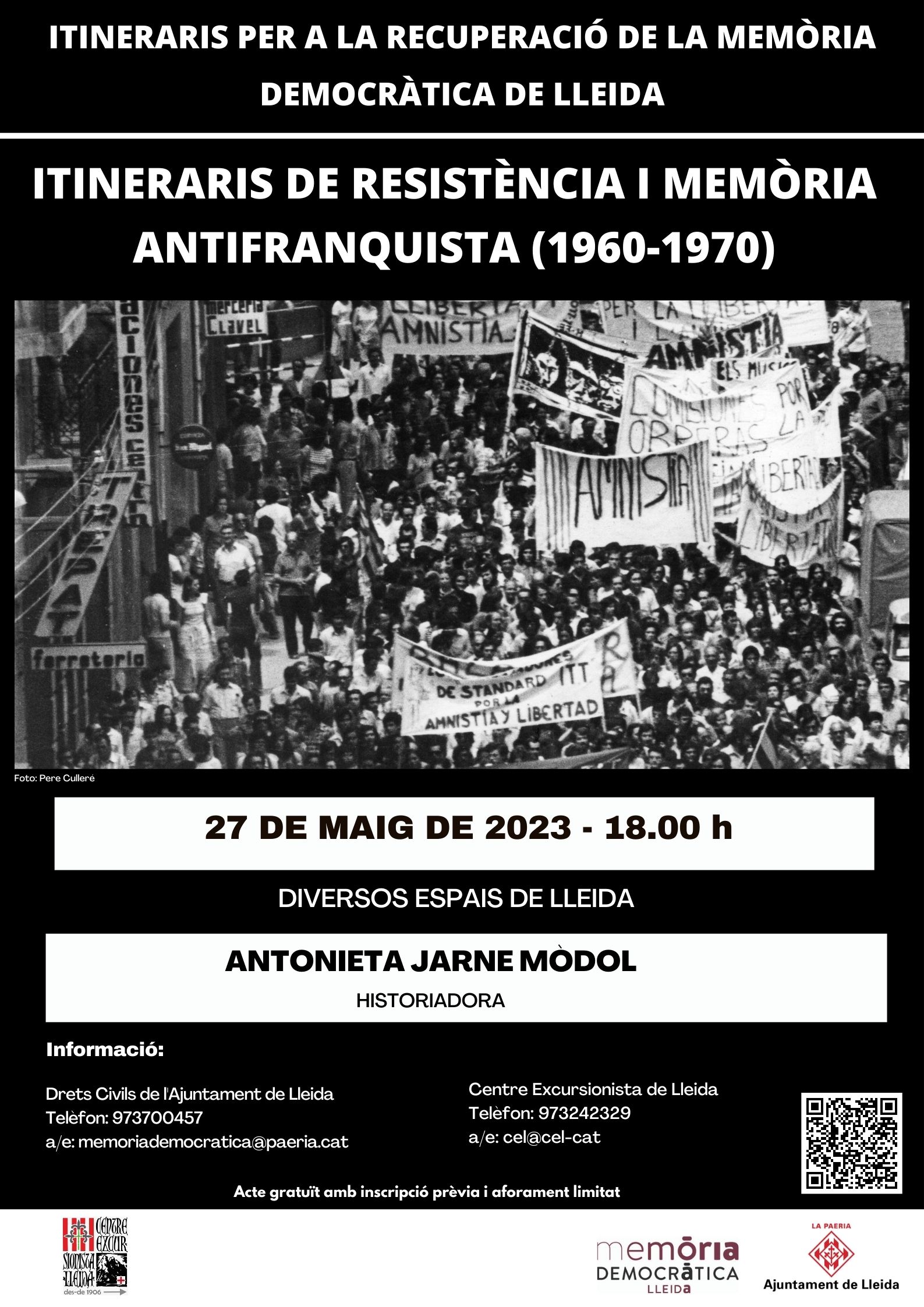 L’Àrea de Memòria Democràtica de l’Ajuntament de Lleida ha organitzat un nou itinerari per a la Recuperació de la Memòria Democràtica anomenat “Itineraris de resistència i memòria antifranquista (1960-1970)”