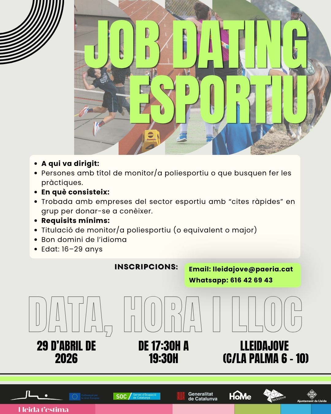 "Si busques feina de monitor/a d'esports i/o no saps on fer les pràctiques, vina aquí on coneixeràs centres esportius de Lleida, el dia 29 d'Abril a les 17:30h a Lleidajove.