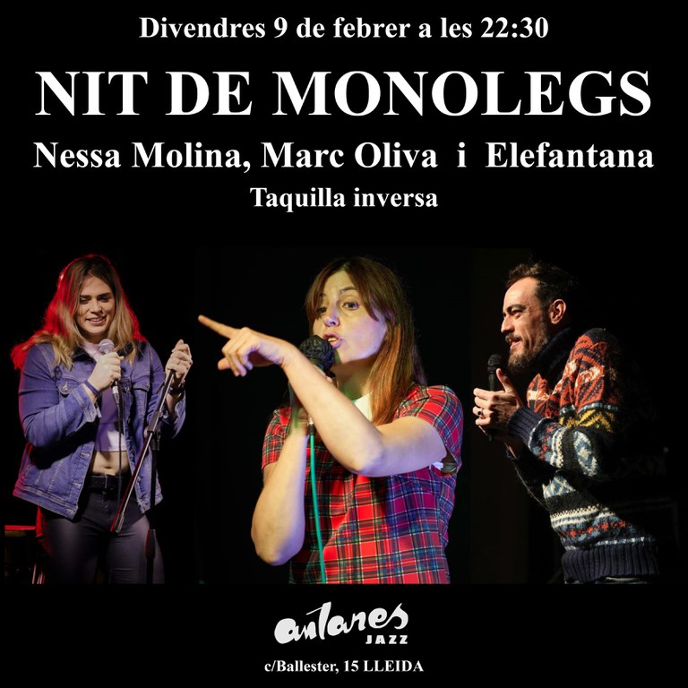 Tres monologuistes de la terra bregats en l’àrida escena de Barcelona prometen arrencar-vos uns jejes i uns jazzjazz amb les seves hilarants ocurrències. Nessa Molina és jurista, humorista lleidatana i crossfitera. A través del seu humor àcid i sarcàstic ens narra episodis de la seva vida que no sempre acaben amb èxit. Després de mitja vida exercint de periodista, la monologuista lleidatana Elefantana ha trobat en la comèdia, als cinquanta anys, un espai per reinventar-se. El Marc Oliva és un còmic conegut per no ser conegut. És un dels organitzadors i presentadors de L’Altre Mic - micro obert en català, i ha participat en diferents shows d’stand-up de l’escena de Barcelona. També se l’ha pogut veure a TV3 al programa Zona Franca. Aposta per una comèdia que furga en la part fosca i incoherent de l'ésser humà en un exercici d’existencialisme idiota. O això diu ell.