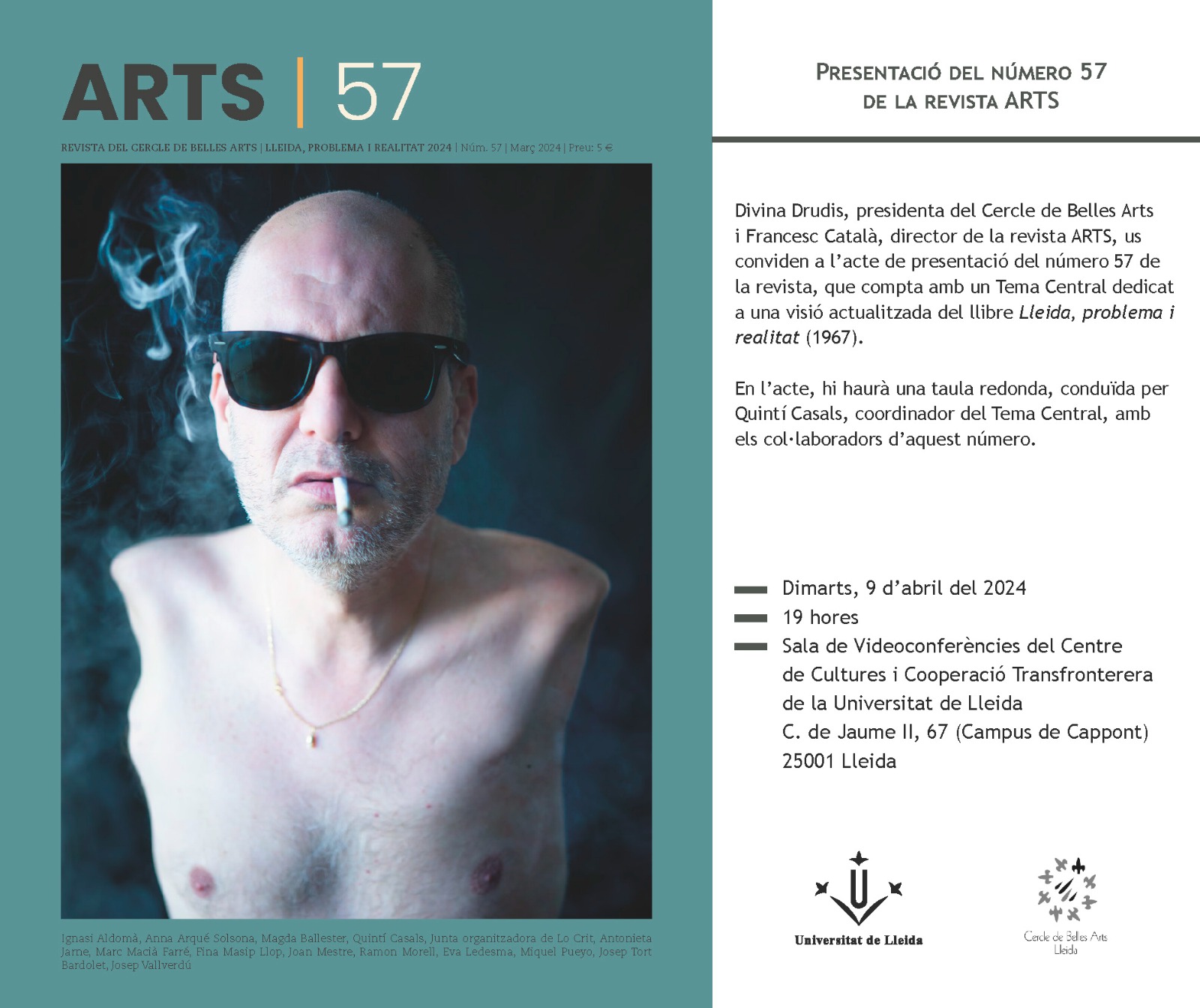 Divina Drudis, presidenta del Cercle de Belles Arts i Francesc Català, director de la Revista ARTS, us conviden a l'acte de presentació del número 57 de la revista, que compta amb un tema central dedicat a una visió actualitzada del llibre Lleida, problema i realitat (1967).