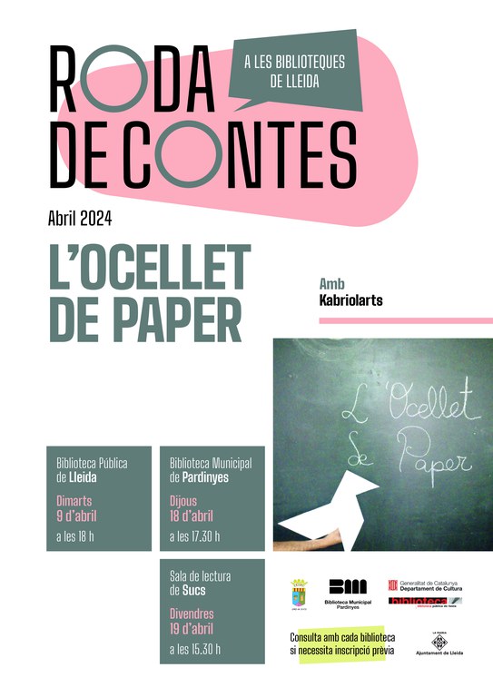 • L’OCELLET DE PAPER, amb Kabriolarts A través de l'ús de titelles i teatre de l'objecte i efectes sensorials, aquest conte pensat per pares, mares i els seus fills, ens fa reflexionar sobre la felicitat que s'oculta darrere de les coses més insignificants i que converteixen el món en un lloc més fabulós. Biblioteca Municipal de Pardinyes