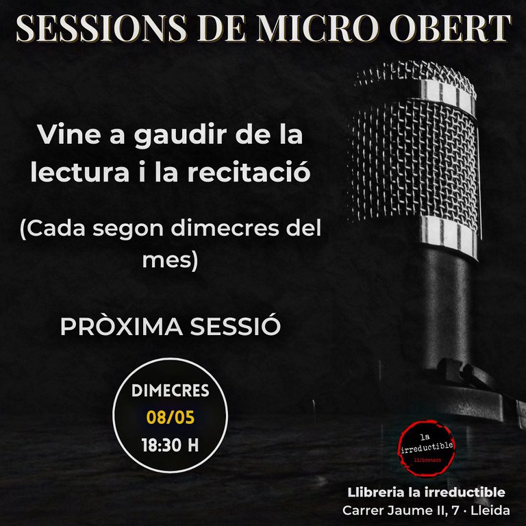 Iniciem les sessions de micro obert. Serà cada segon dimecres de mes. Ens estrenem el pròxim dimecres dia 8 a partir de les 18.30 h. Esteu tots convidats a participar-hi. Veniu a gaudir de la lectura i la declamació en directe!
