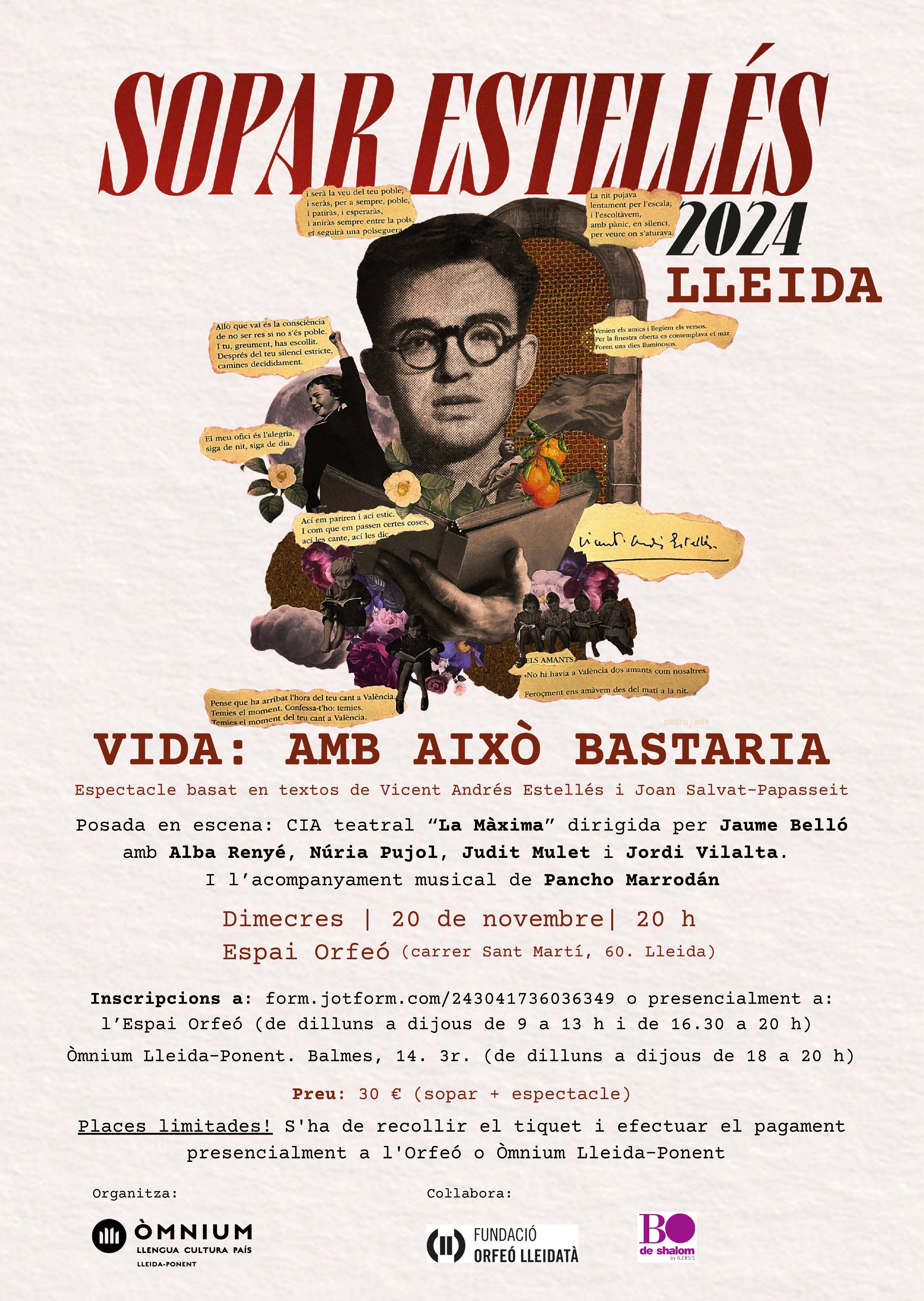 Commemorem el centenari del naixement de Vicent Andrés Estellés amb una edició especial del Sopar anual, el 20 de novembre i el 3 de desembre, a les 20 h, a l’Espai Orfeó, c. Sant Martí, 60, Lleida.