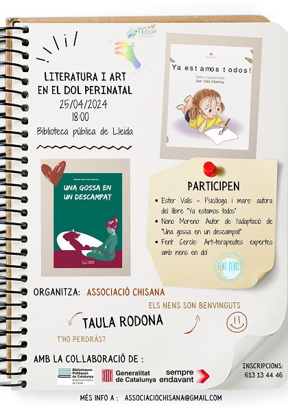 “Literatura i art en el dol perinatal”. Taula rodona amb la participació de: Esther Valls, psicòloga i autora del llibre Ya estamos todos, Nono Moreno, autor de l’adaptació del llibre Una gossa en un descampat i Fent Cercle, art-terapeutes expertes amb nens en dol.