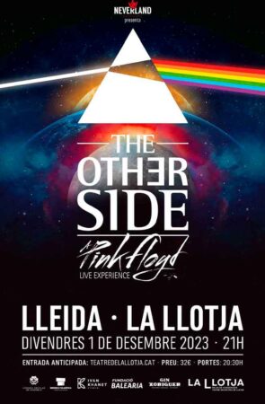 The Other Side és el millor tribut a Pink Floyd del país. Els més de 10 anys a sobre dels escenaris i les diverses gires els avalen. Un espectacle de llums, lásers i so que no deixa indiferent a ningú. Durant més de dues hores reviuràs la sensació de veure i sentir una de les bandes de rock psicodèlic i simfònic més influents de la història. La banda sorprèn amb una acurada selecció de temes en què els grans èxits del quartet britànic conviuen en total harmonia.
