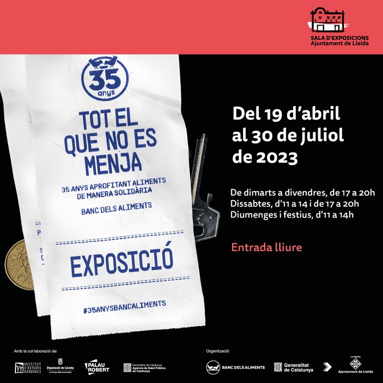 - Organitza: Banc dels Aliments, Departament d'Acció Climàtica, Alimentació i Agenda Rural. Generalitat de Catalunya, Ajuntament de Lleida__ Amb la col·laboració: Palau Robert, Direcció General de Difusió. Generalitat de Catalunya, Agencia de Salut Pública de Catalunya__ Amb el suport: Institut d’Estudis Ilerdencs, Diputació de Lleida__ Comissariat: Banc dels Aliments__ Agraïments: Hospital Clínic i Provincial de Barcelona