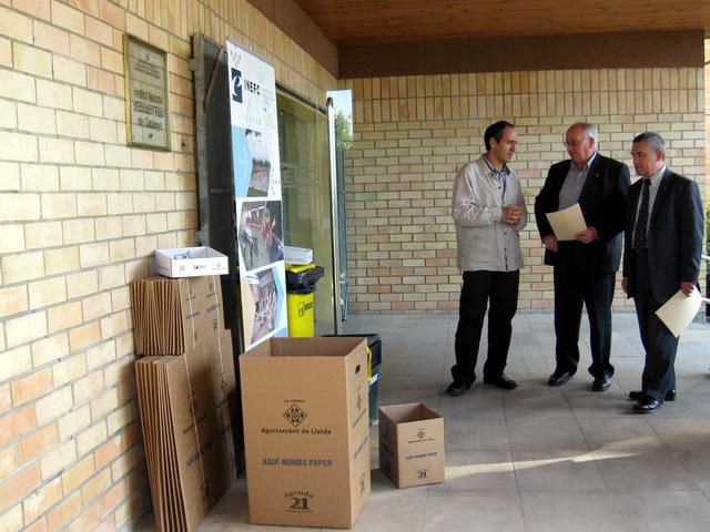 El regidor de Medi Ambient, Josep Barberà, acompanyat del regidor de Sensibilització Ambiental, Joan Gòmez, ha lliurat aquest dilluns 5 contenidors selectius i 75 papereres selectives de paper a INEFC Lleida, representat pel seu director, Cristòfol Salas. L’objectiu és donar suport al projecte d’ambientalització interna “Una aposta integral per la sostenibilitat” que INEFC Lleida està desenvolupant en el marc del programa Ecoentitats de Lleida i que inclou aspectes com la reducció de consums (aigua, energia i recursos), la reutilització de material en desús, la recollida selectiva dels residus i la formació i sensibilització ambiental.