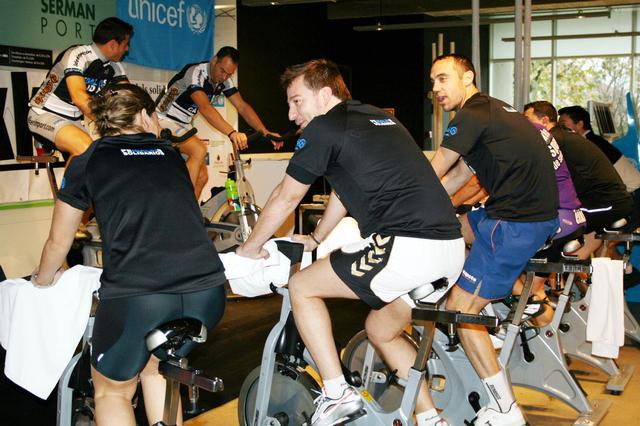 El tinent d'alcalde Txema Alonso participa en la pedalada de 48 hores seguides que aquest dilluns han inicat dos monitors del gimnàs Ekke a favor d'una campanya solidària d'UNICEF