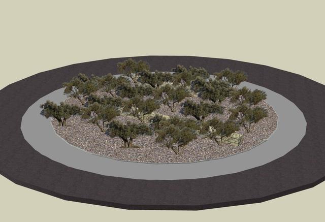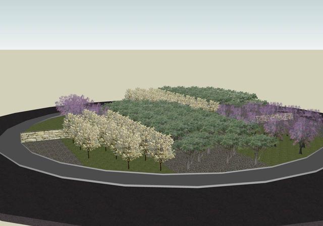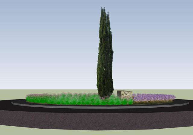 La rotonda situada a la cruïlla de Rufea és una al·legoria del paisatge de secà de les oliveres, com una miniatura d’un camp tradicional, amb els murs de pedra seca que trenquen la geometria de la plantació.