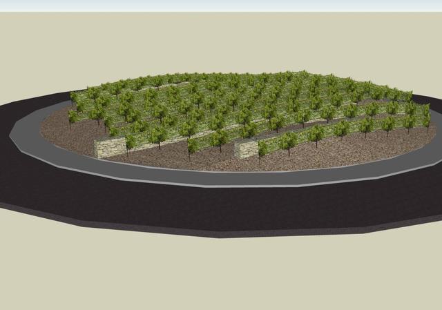 La nova cruïlla de la LL-11 (vial de prolongació de Príncep de Viana) genera una rotonda de grans dimensions, amb una topografia ondulant que acull la plantació tradicional de vinya, amb llargues alineacions de planta formada en vas recolzades sobre murs de pedra seca.