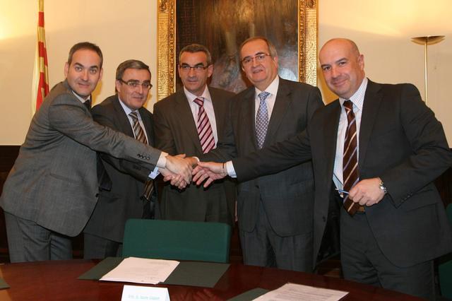 L'alcalde de Lleida, Àngel Ros, el president de la Diputació de Lleida, Jaume Gilabert, el president del Consorci de Promoció Econòmica, Josep Presseguer, i el president de PIMEC, Josep González, han signat aquest divendres un conveni de col·laboració pel desenvolupament del projecte ‘Força Autònoms’.