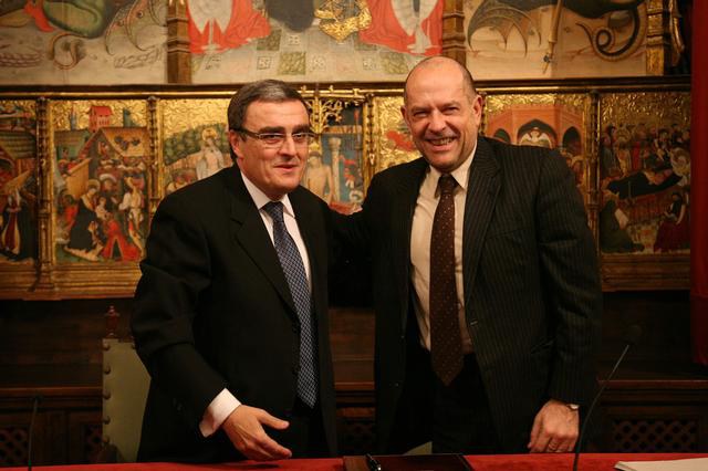 L’alcalde i president de la Fundació Pública Teatre de la Llotja, Àngel Ros, i el director general de la Fundació Gran Teatre del Liceu, Joan Francesc Marco, firmen avui el conveni de col•laboració que permetrà la representació d’espectacles del Liceu al nou teatre de Lleida. L’equipament estrena avui la seva programació cultural amb l’escenificació de l’òpera Il Trovatore de Verdi, inclosa en el present conveni.