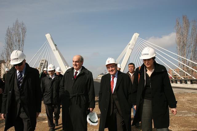L’alcalde de Lleida, Àngel Ros, acompanyat de l’enginyer navarrès autor del projecte, Javier Manterola, i de la primera tinent d’alcalde, Marta Camps, ha visitat aquest dijous els treballs d’asfaltatge que s’estan duent a terme al pont de Príncep de Viana. Les obres del pont entren en la seva final un cop la nova infraestructura ja llueix la seva forma definitiva, després de la col•locació i d’haver tensat els 60 tirants que el sustenten i el tauler del pont ja es mantingui pels cables que conformen els tirants, prescindint de les piles provisionals que es van construir per aguantar el pont mentre es realitzaven les obres del viaducte.