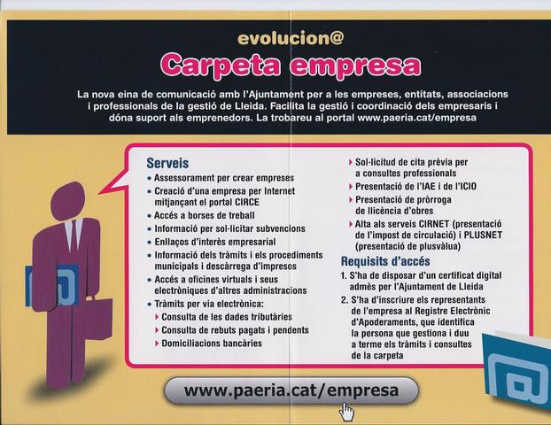 La posada en funcionament de la nova Carpeta Empresa s’emmarca en la convicció de l’Ajuntament de Lleida d’aprofuncir en l’administració digital que permet optimitzar al màxim el servei al ciutadà ja que representa una finesta d’atenció oberta les 24 hores i permet ‘deslocalitzar’ els tràmits i les gestions que pòden realitzar-se, per exemple, des del domicili particular. La Carpeta Empresa es troba a dins de la Seu Electrònica de l’Ajuntament de Lleida, aspecte en què la Paeria és pionera en donar resposta i compliment a la llei 11/2007 d'accés electrònic dels ciutadans als serveis públics i on hi trobem d’altres aplicacions, a banda de la Carpeta Empresa, com són la Carpeta Ciutadana, el Registre d'entrada i sortida i la tramitació electrònics 24x7 o el Perfil del Contractant.
