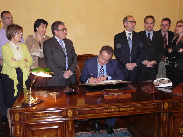 El ministre de Treball i Immigració, Celestino Corbacho, ha visitat avui la Paeria on ha signat al Llibre d'Or de la Ciutat i ha mantingut una breu trobada amb la corporació municipal.