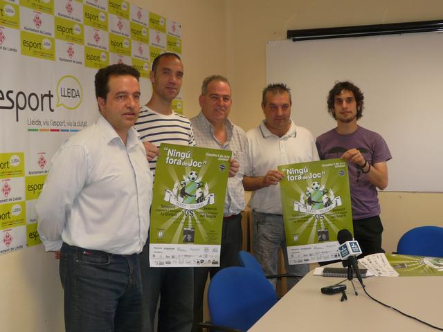 El tinent d’alcalde Txema Alonso, acompanyat de l’alcalde d’Almenar, Pascual Izquierdo, l’exjugador professional Xavier Sánchez, el fundador de l’Associació Agrupa’t, Iñaki Ramos, i l’entrenador del combinat de jugadors del Segrià, Félix Jiménez, han presentat aquest matí el partit de futbol benèfic “Ningú fora de joc”, que es celebrarà a Almenar el proper dissabte 5 de juny a les 19 hores de la tarda. Al partit participarà una àmplia selecció de jugadors del Segrià, així com ex-jugadors de primera divisió.