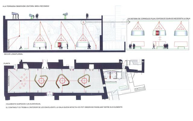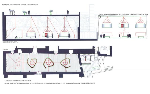 El projecte contempla utilitzar els dos espais de la Suda: la sala i la terrassa mirador. A la sala s’instal•laran tres pantalles envolvents -blanques i flotants- a dins de les quals circularà el visitant i podrà conèixer detalls de la història de l'edifici.
