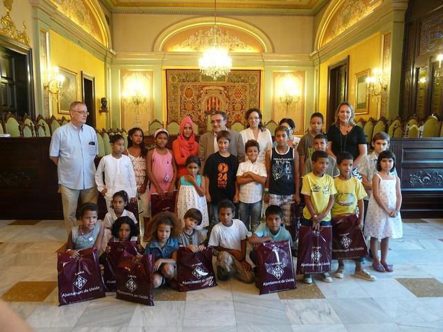 L’alcalde de Lleida, Àngel Ros, i els regidors M. Rosa Ball, Neus Brocal i Jesús Castillo, han rebut al Saló de Plens de la Paeria una vintena de nens i nenes sahrauís, acollits per l’Associació d’Amics del Sàhara de les Terres de Ponent i per diverses famílies de la ciutat. L’acolliment d’aquest grup de nens s’inclou en un projecte subvencionat per l’Ajuntament de Lleida amb 18.468,00 euros, que sufraga les despeses ocasionades pels vols, transport i estada a la ciutat.