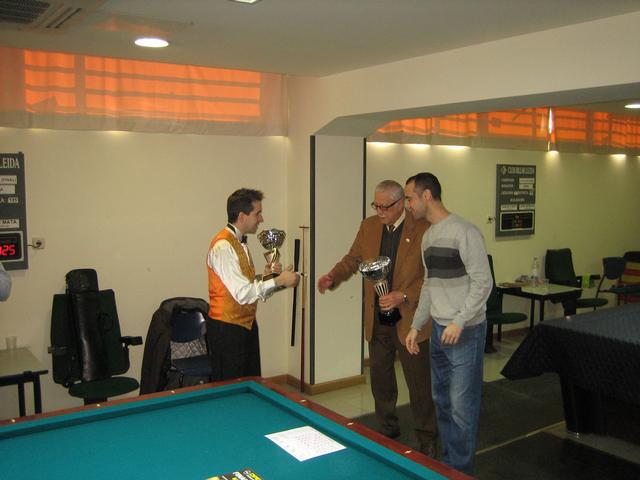 El tinent d’alcalde i responsable d’esports de l’Ajuntament de Lleida, Txema Alonso, ha presidit aquest migdia el lliurament de trofeus de la final del Campionat de Catalunya de Billar, en la modalitat Banda de 1a Categoria, que ha tingut lloc a les instal•lacions del Club Billar Lleida. Esteve Mata, del Club SCB Centelles, ha estat el guanyador del torneig.