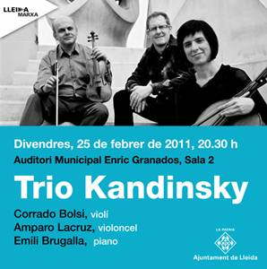 El Trio Kandinsky actua el proper divendres, 25 de febrer, a les 20.30 h, a l'Auditori Municipal Enric Granados, en el marc de la Temporada de concerts 2010-2011. Aquest conjunt de violí, violoncel i piano interpretaran dos trios de Dvorak i Granados.