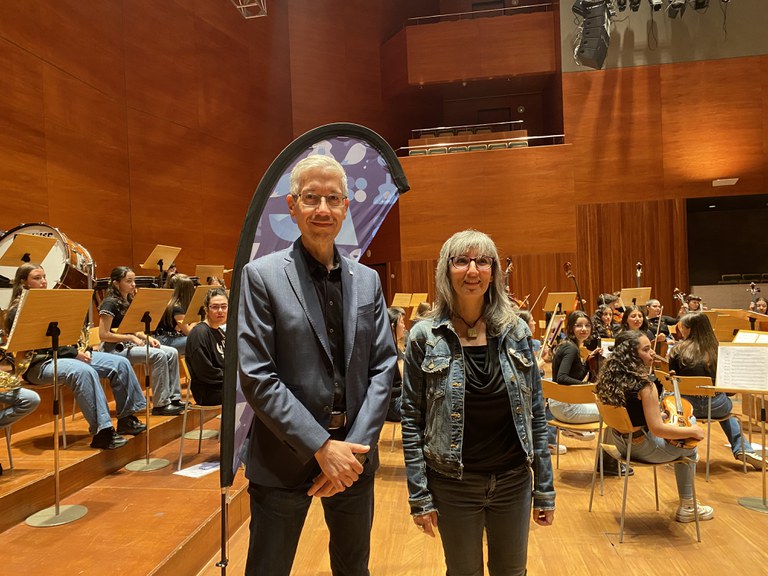 La tinent d'alcalde i regidora d'Educació, Cooperació, Drets Civils i Feminisme, Sandra Castro i el director dels Serveis Territorials d'Ensenyament a Lleida, Claudi Vidal, han assistit a l'acte orquestral que donava el tret de sortida al primer dels tres itineraris de la Primera Jornada de les Arts.