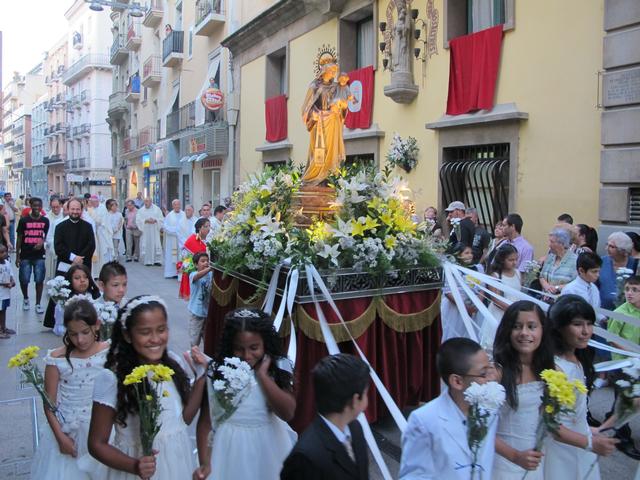 En aquesta processó estan convidats els nens i nenes que han fet la primera comunió aquest any i són ells els qui porten les cintes de la Verge. La processó ha sortit de la porta del carrer del Carme i ha passat pels carrers Magdalena, Pi i Maragall i Igualada per entrar al col·legi de la Sagrada Familia, on té lloc l’ofrena floral. Diversos col·lectius, com els parroquials, associacions de veïns, la comunitat llatinoamericana o els romanesos catòlics o ortodoxos, ha participat en l’ofrena, que ha estat acompanyada de diversos cants corals. Posteriorment, la processó ha tornat a l’església del Carme.