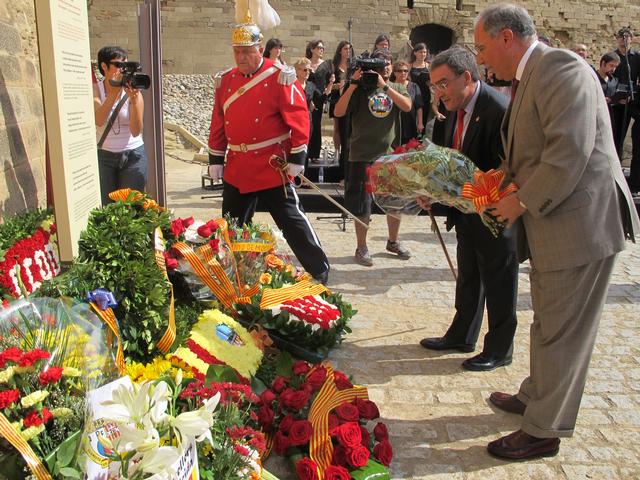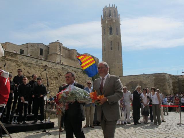 Els actes de celebració de la Diada Nacional de Catalunya a Lleida s’han centrat al turó de la Seu Vella, on durant tot el matí s’han succeït les ofrenes florals de les entitats de la societat civil lleidatana. L’alcalde de Lleida, Àngel Ros, ha president l’acte institucional, en què ha reivindicat la defensa de l’estat del benestar i de l’actual model educatiu català, així com també la importància de la formació per sortir de la crisi econòmica, que afecta especialment els joves. El paer en cap considera que “hem de ser capaços de sortir com a nació d’una situació dura de crisi econòmica i també de mantenir un estat del benestar que hem construït amb esforç durant molts anys”.