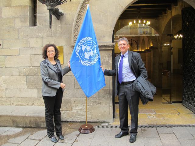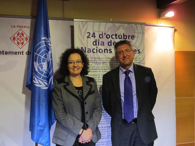 Lleida celebra avui el dia de les Nacions Unides, amb motiu del 66è aniversari de la fundació d’aquest organisme multilateral que promou l’entesa i la cooperació entre tots els països del món. La regidora de Drets Civils, Cooperació i Igualtat, Maria Rosa Ball, i el President de l’Associació per les Nacions Unides a Espanya a Lleida, Antoni Blanc, han presentat aquest matí els actes organitzats amb motiu d’aquesta efemèride, on destaca la hissada de bandera de les Nacions Unides a la plaça Paeria i la col•locació d’un panell explicatiu sobre la història i funcions d’aquest organisme internacional. D’aquesta manera, l’Ajuntament de Lleida vol commemorar dos fets fonamentals. Per una banda, la importància de la tasca a favor de la pau que porta a terme les Nacions Unides des de fa més de 60 anys i, en segon lloc, la importància dels municipis, ciutats i pobles en la concreció de la realització dels drets humans i la pau a tots els nivells.