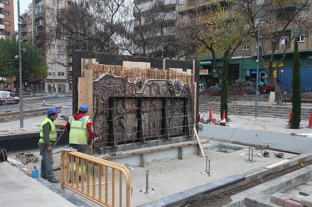 La primera tinent d'alcalde, Marta Camps, ha explicat que un cop s’ha obtingut la còpia del mural en bronze, aquest s’està instal·lant dins del vas de la font ornamental, concretament encastat en una cara del muret de formigó que s’ha construït a l’interior de la fona. A l’altra cara, un dels escultors originals, Alejandro Narvaiza, ha dissenyat un altre mural que representarà els fruit de la terra donant, així, continuïtat al tema de la pagesia que envolta la plaça. Amb la còpia del mural en bronze, s’ha pogut fer la demolició dels murs de formigó alliberant l’espai central de la plaça i obrint la visibilitat de la plaça a l’exterior. (s'adjunta arxiu de so)