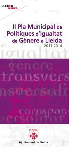 Els 9 eixos estratègics que estructuren el II Pla Municipal de Polítiques d’Igualat de Gènere a Lleida 2011-2014 són: l’eix transversal de gènere, salut i benestar, educació i formació, treball i conciliació, violència masclista, participació i apoderament, urbanisme, habitatge i medi ambient, esports, i cultura i lleure. Després, cada un dels eixos té uns objectius generals i específics, amb actuacions concretes, 111 en total.