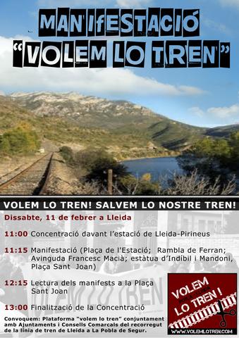 La manifestació està convocada per la Plataforma “Salvem lo tren”, conjuntament amb una gran majoria d’Ajuntaments i Consells Comarcals que formen part del recorregut de la línia de tren de Lleida a la Pobla de Segur, entre ells l’Ajuntament de Lleida.