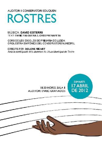 La sala 1 de l’Auditori Municipal Enric Granados acollirà demà dimarts la representació de la cantata escènica “Rostres”, amb música de David Esterri i lletra d’Enric Falguera i Jordi Prenafeta. Hi participen els alumnes de cicle superior de 13 escoles de primària de Lleida i l’Orquestra Simfònica del Conservatori Municipal de Música de Lleida, dirigits per Dolors Ricart.